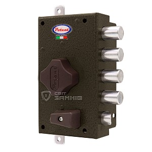Данная модель предназначена для дверей ПРАВОГО открывания. Снаружи замок управляется сердцевиной с помповым ключом. Она приводит в действие 4 круглых стальных ригеля диаметром 16 мм и дополнительные проушины, к которым можно подсоединить тяги и девиаторы. Благодаря этому закрывание происходит в 3 стороны. Полный выход ригелей составляет 22 мм. При открывании и закрывании двери ключ выталкивается из сердцевины. Такие ключи имеют малые размеры, поэтому их удобно носить в кармане или сумке небольшого размера. Изнутри замок закрывается поворотом воротка. Дополнительно также присутствует защелка (язычок). Она управляется засовом также только изнутри помещения. Бронированная сердцевина обладает защитой от проворачивания методом "свёртыша" и устойчивой к высверливанию защитной шайбой. Дополнительные штифты в кодовой части обеспечивают 170000 возможных комбинаций и защиту от отмычек. Это делает почти невозможным подбор ключа. Ригели защищены от забивания. В данной комплектации присутствует цилиндр длиной 70 мм. В случае большей или меньшей толщины двери можно заказать модель замка с другой длиной – 50, 60 или 80 мм.