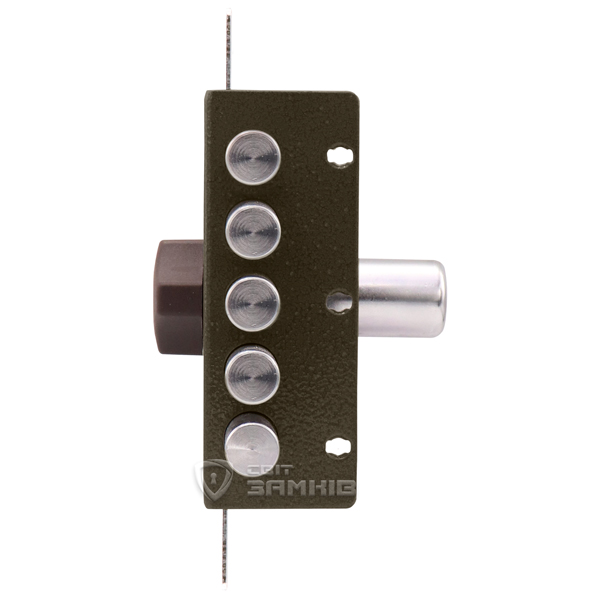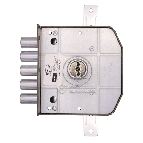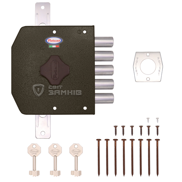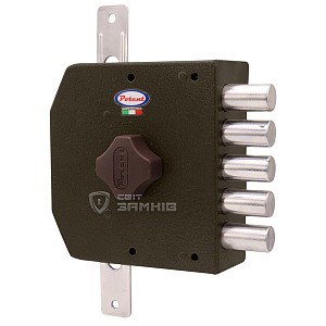 Данная модель предназначена для дверей левого открывания. Снаружи замок управляется сердцевиной с помповым ключом. Она приводит в действие 5 круглых стальных ригелей диаметром 18 мм и дополнительные проушины, к которым можно подсоединить тяги и девиаторы. Благодаря этому закрывание происходит в 3 стороны. Полный выход ригелей составляет 32 мм. При открывании и закрывании двери ключ выталкивается из сердцевины. Такие ключи имеют малые размеры, поэтому их удобно носить в кармане или сумке небольшого размера. Изнутри замок закрывается поворотом воротка. Бронированная сердцевина обладает защитой от проворачивания методом "свёртыша" и устойчивой к высверливанию защитной шайбой. Дополнительные штифты в кодовой части обеспечивают 170000 возможных комбинаций и защиту от отмычек. Это делает почти невозможным подбор ключа. Ригели защищены от забивания. В данной комплектации присутствует цилиндр длиной 70 мм. В случае большей или меньшей толщины двери можно заказать модель замка с другой длиной – 50, 60 или 80 мм.