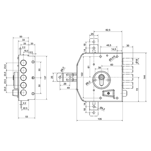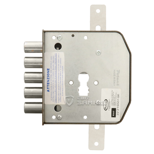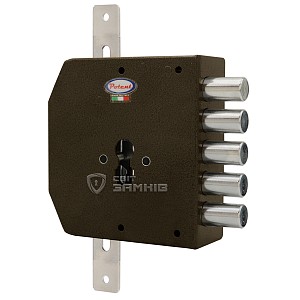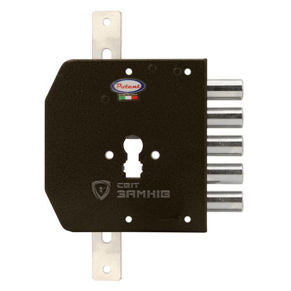 Данная модель предназначена для дверей ПРАВОГО открывания. Замок управляется сердцевиной стандарта EURO DIN. Она приводит в действие 5 круглых стальных ригелей диаметром 18 мм и дополнительные проушины, к которым можно подсоединить тяги и девиаторы. Благодаря этому закрывание происходит в 3 стороны. Полный выход ригелей на 30 мм происходит за 2 оборота ключа. Главной защитной фишкой стала блокировка при попытках выбивания или перелома сердцевины. Ответная планка входит в комплект.