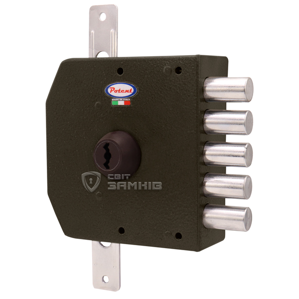 POTENT 500 – это 5-ригельный итальянский замок. Устанавливается накладным способом на дверное полотно. Используется на входной деревянной и металлической двери квартиры или дома. Также его часто выбирают для монтажа в гаражах или складских помещениях, где установить врезной замок нет возможности или это нецелесообразно.