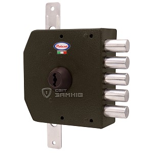 Данная модель предназначена для дверей левого открывания. Замок управляется сердцевиной с помповым ключом. Она приводит в действие 5 круглых стальных ригелей диаметром 18 мм и дополнительные проушины, к которым можно подсоединить тяги и девиаторы. Благодаря этому закрывание происходит в 3 стороны. Полный выход ригелей составляет 32 мм. При открывании и закрывании двери ключ выталкивается из сердцевины. Такие ключи имеют малые размеры, поэтому их удобно носить в кармане или сумке небольшого размера. Бронированная сердцевина обладает защитой от проворачивания методом "свёртыша" и устойчивой к высверливанию защитной шайбой. Дополнительные штифты в кодовой части обеспечивают 170000 возможных комбинаций и защиту от отмычек. Это делает почти невозможным подбор ключа. Ригели защищены от забивания. В данной комплектации присутствует цилиндр длиной 70 мм. В случае большей или меньшей толщины двери можно заказать модель замка с другой длиной – 50, 60 или 80 мм. Ответная планка входит в комплект.