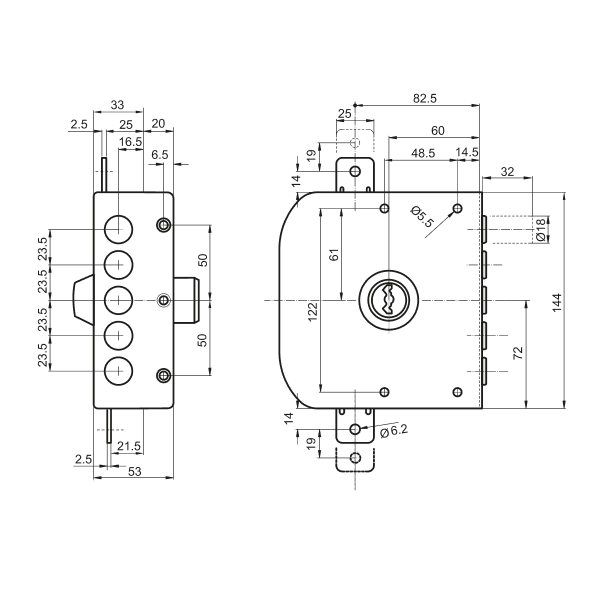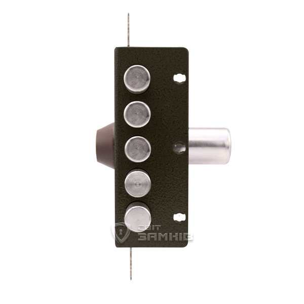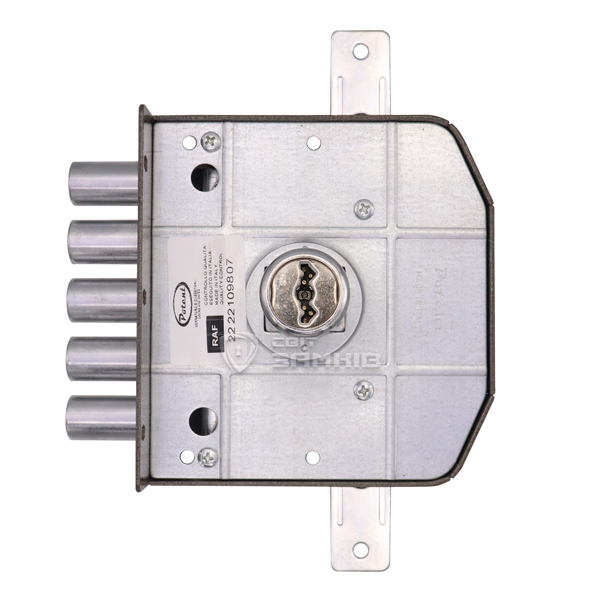 Данная модель предназначена для дверей ПРАВОГО открывания. Замок управляется сердцевиной с помповым ключом. Она приводит в действие 5 круглых стальных ригелей диаметром 18 мм и дополнительные проушины, к которым можно подсоединить тяги и девиаторы. Благодаря этому закрывание происходит в 3 стороны. Полный выход ригелей составляет 32 мм. При открывании и закрывании двери ключ выталкивается из сердцевины. Такие ключи имеют малые размеры, поэтому их удобно носить в кармане или сумке небольшого размера. Бронированная сердцевина обладает защитой от проворачивания методом "свёртыша" и устойчивой к высверливанию защитной шайбой. Дополнительные штифты в кодовой части обеспечивают 170000 возможных комбинаций и защиту от отмычек. Это делает почти невозможным подбор ключа. Ригели защищены от забивания. В данной комплектации присутствует цилиндр длиной 70 мм. В случае большей или меньшей толщины двери можно заказать модель замка с другой длиной – 50, 60 или 80 мм. Ответная планка входит в комплект.