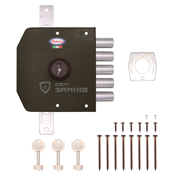 POTENT 500 – это 5-ригельный итальянский замок. Устанавливается накладным способом на дверное полотно. Используется на входной деревянной и металлической двери квартиры или дома. Также его часто выбирают для монтажа в гаражах или складских помещениях, где установить врезной замок нет возможности или это нецелесообразно.