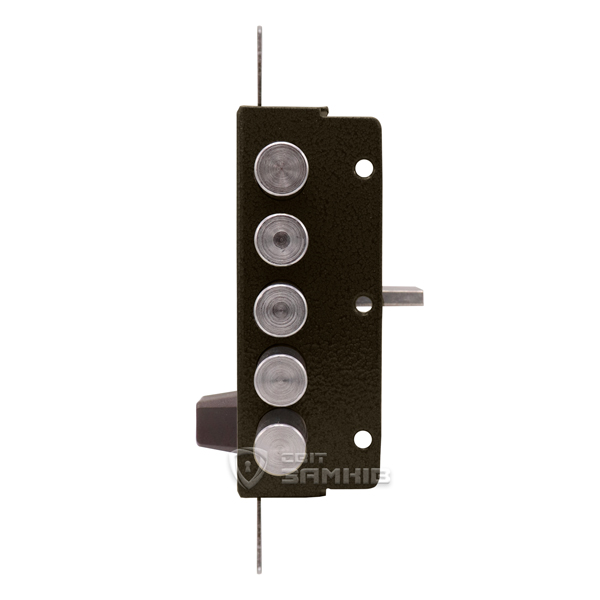 Данная модель предназначена для дверей ПРАВОГО открывания. Замок управляется сувальдным механизмом. Он приводит в действие 5 круглых стальных ригелей диаметром 18 мм и дополнительные проушины, к которым можно подсоединить тяги и девиаторы. Благодаря этому закрывание происходит в 3 стороны. Полный выход ригелей на 32 мм происходит за 4 оборота ключа. Благодаря 6-м подпружиненным сувальдам достигается секретность замка в 50 000 возможных комбинаций. Это делает возможность подбора ключа маловероятным. Дополнительно также присутствует защелка (язычок). Она управляется засовом только изнутри помещения. Ответная планка входит в комплект.