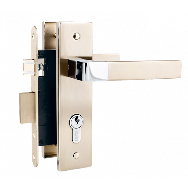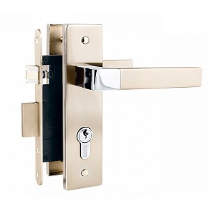 Комплект LINDE A-2004 PZ включает в себя ручки на планке, сердцевину и замок. Устанавливается в деревянную межкомнатную или входную дверь. Фиксация происходит при помощи одного ригеля. Есть язычок. Он реверсивный, потому замок подходит для право и левосторонних полотен. Комплект выполнен в сочетании цветов "матовый никель/полированный хром", поэтому особенно удачно будет смотреться на дверях светлых оттенков.