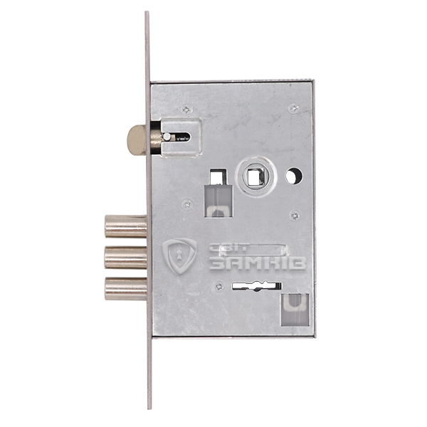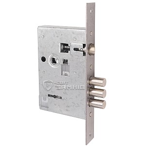 Закрывание осуществляется тремя ригелями из стали диаметром 16 мм. Они надежно фиксируют дверь, обеспечивая достаточный уровень безопасности. Язычок реверсивный, поэтому замок можно установить как и на левую, так и на правую дверь. У данной версии в комплектации 5 ключей.