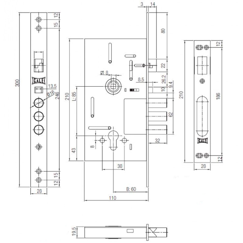 Дверная фурнитура турецкой ТМ KALE является одной из лучших по соотношению цена/качество. Данная модель - это 3-х ригельный основной врезной замок, который устанавливается на металлические входные двери. Полный выход ригелей диаметром 16 мм составляет 32 мм. Управляется ручками и сердцевиной стандарта EURO DIN. Она в комплект не входит и докупается отдельно в зависимости от ваших потребностей. Подходит как для лево, так и правосторонних дверей. Замок имеет отверстия для крепления протектора на сердцевину. Особенностью данного замка является автоматическая блокировка при закрывании дверей с помощью специальной защелки.